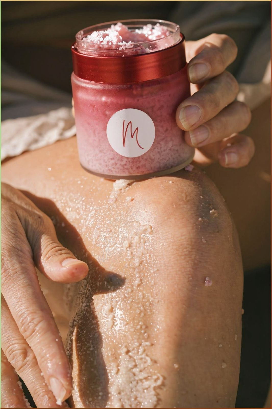 Take a generous amount of scrub and massage it onto your skin using gentle, circular motions.